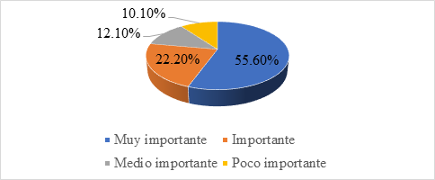 Según datos obtenidos sobre la importancia del empoderamiento ante el deterioro ambiental que sufrió el Recinto siete ríos en el año 2022 2023 los encuestados manifiestan en un 55.6% que es muy importante, para el 22.20% importante, de poca importancia el 12.10% mientras que para el 10.10 % medianamente, en la cual identificamos que para más del 80% es muy importante el empoderamiento comunitario ante el deterioro ambiental