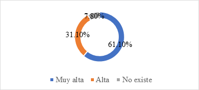 De igual manera indican sobre la existencia de fenómenos antrópicos como la deforestación, contaminación del agua, sobreexplotación de recursos, los moradores indicaron en 54.4% que es baja, el 18.9% media y el 8,9% no existe, evidenciando que los fenómenos naturales causados por los hombres bajo en más de un 50%