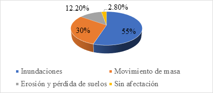 De estos datos obtenidos las familias han sufrido alguna afectación por el deterioro ambiental, en un 40.0% por inundaciones, el 30 % por movimientos de masa, 12.2% por erosión y perdida de suelos, y el 1.1% ninguna afectación, lo que indica que más del 80% de los encuestados sufrieron alguna afectación a consecuencia del deterioro ambiental