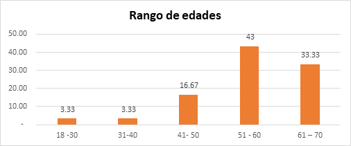 De acuerdo a los datos obtenidos en relación a rango de edades, se determina que de los cuidadores encuestados el 3,33% tienen entre 18 a 30 años, el 3,33% tienen 31 a 40 años, 16,67% tienen entre 41 a 50 años de edad, 3l 33% entre 61 a 70 años y el 43% entre 51 a 60 años.