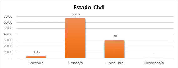 De acuerdo a los datos obtenidos en relación al estado civil de los cuidadores, se determina que el 0% son divorciados/as, el 3,33 son solteros/as, el 30% se encuentran en unión libre y el 66.67% están casados/as.