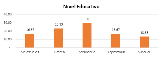 De acuerdo a los datos obtenidos en relación al nivel educativo, los cuidadores tienen en un 13,33% superior 16,67% preparatoria, 16,67% sin estudios, el 23,33% tienen primaria y el 30% la secundaria.