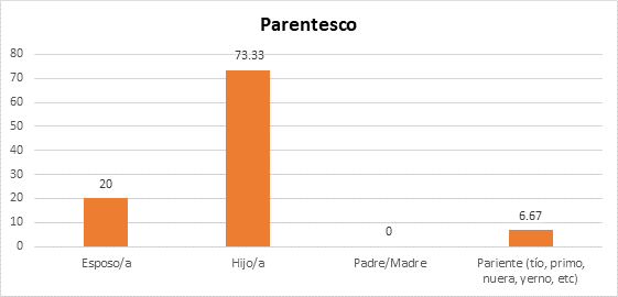 De acuerdo a los datos obtenidos en relación al parentesco, el de mayor prevalencia es ser hijos/as con el 73,33%, seguido del 20% al ser esposo/a, el 6,67% pariente (tío, primo, nuera, yerno, etc.) y el 0% padre/madre, de los cuales asumen el rol de cuidador.