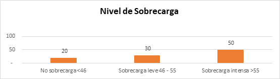Con respecto al nivel de sobrecarga, el estudio se encontró que el 50% de los cuidadores presentan sobrecarga intensa, el 30% presentó sobrecarga leve y el 20% no presenta sobrecarga. Estos resultados difieren de los hallados por Diaz “Habilidad de cuidado y nivel de sobrecarga en cuidadoras/es informales de personas dependientes”, en el año 2015 en Chile, encontraron un 76,8% presentaron ausencia de sobrecarga, mientras que el 9.3% de los cuidares primarios mostraron sobrecarga leve y el 13.9%, sobrecarga intensa. Es así que, los estudios han evidenciado que la carga que experimentan los cuidadores no solo depende de las exigencias del cuidado, sino también de aspectos personales y contextuales, lo que podría explicar las variaciones en los niveles de sobrecarga observados en distintos estudios. (Pinquart & Sörensen, 2003).