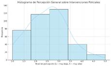 El histograma evidencia que la mayor concentración de respuestas se encuentra en los niveles 2 y 3 de percepción. Esto respalda el valor promedio reportado (2,53), mostrando que una gran parte de la muestra tiene una percepción neutral o ligeramente negativa respecto a las acciones policiales.