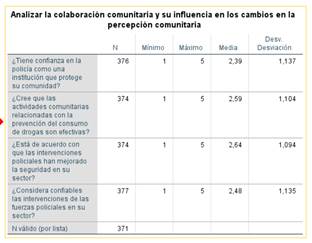 En relación con el objetivo "Analizar la colaboración comunitaria y su influencia en los cambios en la percepción comunitaria", mediante el análisis descriptivo de las variables, se observa lo siguiente: En la pregunta "¿Tiene confianza en la policía como una institución que protege su comunidad?", la media fue de (2,39) con una desviación estándar de (1,137), lo cual indica una tendencia hacia una percepción baja en cuanto a la confianza ciudadana hacia la institución policial. En la pregunta "¿Cree que las actividades comunitarias relacionadas con la prevención del consumo de drogas son efectivas?", se obtuvo una media de (2,59), con una desviación estándar de (1,104), mostrando una percepción ligeramente superior, aunque aún cercana a un nivel neutro, respecto a la efectividad de dichas actividades preventivas.