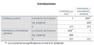 En el análisis de correlaciones de Pearson entre las variables "confianza en la policía" y "actividades comunitarias efectivas", se observa una correlación positiva alta (r = 0,849, p < 0,01), indicando que a medida que se incrementa la percepción de confianza en la institución policial, también mejora la percepción de efectividad de las actividades comunitarias de prevención.