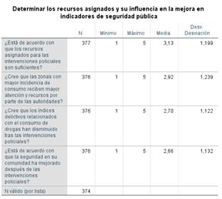 Respecto al impacto en la delincuencia, en la pregunta "¿Cree que los índices delictivos relacionados con el consumo de drogas han disminuido tras las intervenciones policiales?", se obtuvo una media de (2,80) y una desviación estándar de (1,122), reflejando una percepción baja-media sobre la efectividad de las intervenciones en la disminución delictiva.