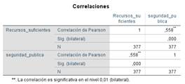 En el análisis de correlaciones de Pearson entre las variables "recursos suficientes" y "seguridad pública", se evidenció una correlación positiva moderada (r = 0,558, p < 0,01), lo que indica que a medida que aumenta la percepción de suficiencia en los recursos asignados, también mejora la percepción de seguridad en la comunidad.
