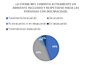 Uno de los hallazgos más relevantes es la persistencia de barreras estructurales y actitudinales que limitan la plena integración del personal con discapacidad. Según Ramírez y Pazmay (2023), esto no se debe a la falta de normativa, sino a su escasa aplicación, reflejada en el bajo cumplimiento de la cuota del 4 % y la limitada sistematización de políticas inclusivas. En la ESPAM-MFL, aunque existe un compromiso incipiente, persisten deficiencias en infraestructura, tecnologías adaptadas y formación del personal, en línea con lo señalado por Taruchaín et al. (2021).