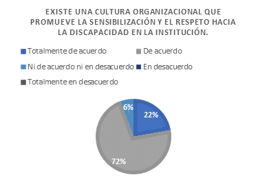 Existe una percepción mayoritaria favorable hacia la cultura institucional que valora la discapacidad. Esto se atribuye posiblemente a la presencia de normativas internas o a un entorno donde se han consolidado ciertos principios de respeto e inclusión. Aun así, se perciben algunos matices que podrían reflejar experiencias distintas según el rol o el área dentro de la institución. |