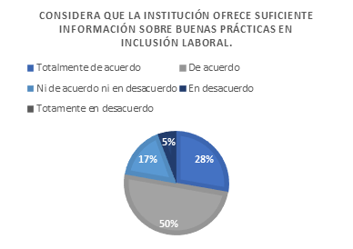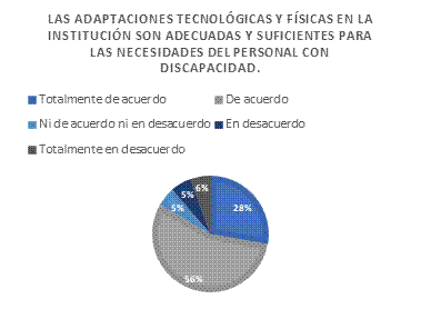Más de la mitad de los encuestados consideran que las adaptaciones tecnológicas y físicas en la institución son insuficientes para el personal con discapacidad. Solo un pequeño porcentaje se siente satisfecho con estas adecuaciones, lo que indica una falta de recursos y ajustes necesarios que podrían afectar negativamente la inclusión y el bienestar de estos empleados.