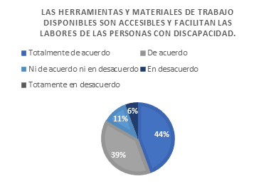 Casi la mitad de los encuestados expresa que las herramientas y materiales de trabajo no son accesibles ni adecuados para el personal con discapacidad. Aunque hay un porcentaje que sí se siente satisfecho, la alta insatisfacción resalta la necesidad de mejorar la accesibilidad, lo cual es crucial para garantizar un entorno laboral equitativo y productivo.