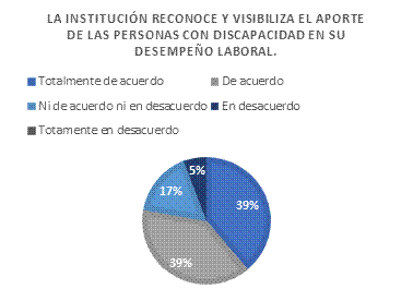 Una parte considerable de los encuestados considera que este reconocimiento sí se da, sin embargo, un porcentaje notable se muestra en desacuerdo o es neutral. Esto indica que, a pesar de que existe cierto reconocimiento, la visibilidad y valoración plena del aporte de las personas con discapacidad en el ámbito laboral de la institución aún requiere fortalecerse para asegurar una inclusión más completa y equitativa. |