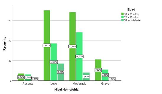 Uno de los factores clave para padecer esta anomalía es la edad, junto con el entorno, ya que los estudiantes más jóvenes se benefician de la tecnología de múltiples maneras, lo que la convierte en un elemento crucial en la vida diaria. Actualmente, el internet se utiliza para actividades como estudios, comunicación, trabajo, entre otras. Moreno et al., (2020) señalan que ni la edad ni el sexo influyen directamente en el padecimiento de esta enfermedad; sin embargo, se puede determinar que los jóvenes de menor edad presentan niveles más altos de nomofobia