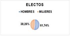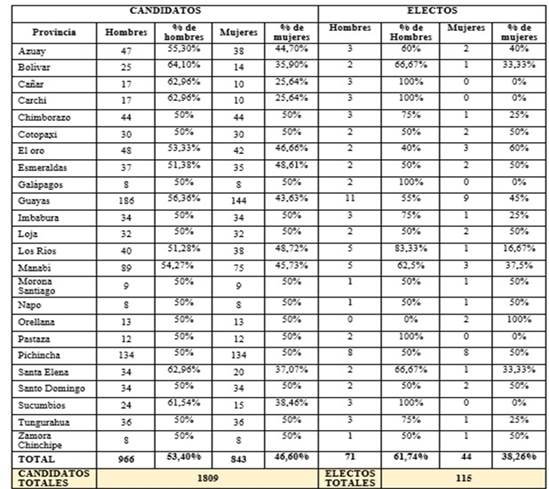 Las listas inscritas fueron estructuradas conforme los principios de paridad, alternancia y secuencialidad. Cada lista se debía consolidar acorde a las circunscripciones de sus territorios. Se postulan un total de 1809 candidatos y candidatas para asambleístas provinciales divididos en 966 hombres y 843 mujeres, lo que porcentualmente se traduce a 53,40% y 46, 60% de las candidaturas totales respectivamente. Acorde se señala en el gráfico 3 los hombres poseen 13% más que las mujeres en el contexto de las candidaturas. Del total de 115 personajes electos, 71 son hombres y 44 son mujeres tal como lo identifica el gráfico 4, los hombres obtienen el 61,74% de los curules totales de la asamblea con relación al 38,26% alcanzado por las mujeres.