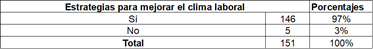 A continuación, se muestran los datos que señalan que el (3%) que corresponde a cinco profesionales no han gestionado estrategias de impacto para mejorar el clima laboral, y el (97%), 146 profesionales han realizado varias acciones integradas a las que concernientes a una labor interdisciplinaria con Seguridad y Salud Ocupacional y de iniciativa propia.