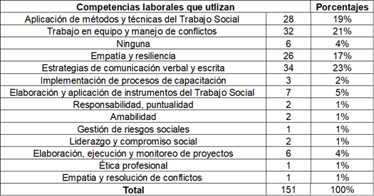 Los resultados desde el enfoque cualitativo, subraya que los trabajadores sociales manifiestan que en su ejercicio profesional han perfeccionado varias competencias relacionadas a la metodología de intervención, dirigidas a los empleados, sus familias, y otros actores sociales, potencializando las competencias: escucha activa, empatía, liderazgo, dirección de grupos, comunicación asertiva, ética, entre otros. Lo que demanda un trabajo interdisciplinario que conduncente a una atención integral.