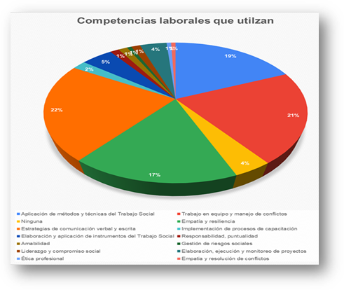 En referencia a los resultados de datos cuantitativos, se observan varias concomitancias a las respuestas señaladas y se evidencia en la gráfica las competencias adquiridas por los profesionales, el porcentaje más alto refiere a las ¨estrategias de comunicación verbal y escrita¨ (23%), ¨el trabajo en equipo y manejo de conflictos¨ (21%), ¨elaboración y aplicación de métodos y técnicas del Trabajo Social¨ (19%), y con el porcentaje más bajo se encuentran ¨la gestión de riesgos sociales¨, ¨liderazgo y compromiso social¨ y ¨empatía y resiliencia¨ con el (1%).