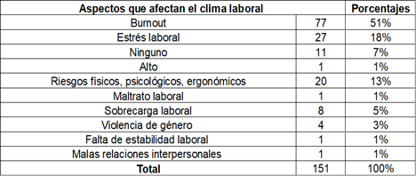Cuando se habla de aspectos que afectan al clima laboral, precisa recordar la definición de este concepto y se considera como el ambiente que existe o se vive en la empresa o en la institución en un momento determinado; y éste puede ser agradable o desagradable para trabajar; o también como la cualidad o propiedad del ambiente general que aprecian o experimentan los empleados o colaboradores, y que influyen en su comportamiento; en tal virtud en estos contextos se advierten aspectos que repercuten o inciden en el funcionamiento de la organización y. Esto puede explicar que el 50% de la población encuestada es decir 77 profesionales responden que el burnout es un elemento importante que influye en el clima laboral, 27 trabajadores sociales que corresponde al 18% asumen al estrés laboral, 20 profesionales que equivale al 13% manifiestan que los riesgos físicos, psicológicos y ergonómicos se constituyen en un indicador importante que afecta al entorno laboral y el 1% es decir un profesional hace referencia a las malas relaciones interpersonales que se desarrollan en el devenir de la Institución.