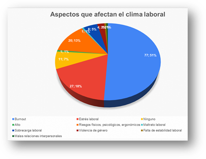 Adicionalmente se destaca que las profesionales manifestaron que en su clima laboral existen situaciones complejas, como desconfianza entre compañeros o departamentos, lo cual conduce a cierto grado de inconvenientes por favoritismos, y dificultades en el trabajo en equipo y conflicto de intereses, todo esto conduce a un ambiente laboral inadecuado.