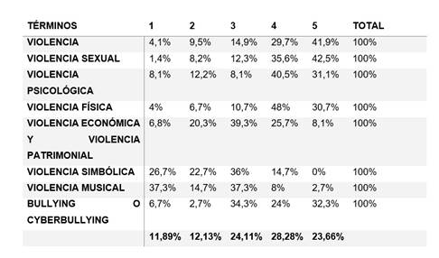 La violencia en los últimos años ha ido surgiendo, y han adoptado nuevos términos y formas de operación se analizó el nivel de conocimiento que tiene los estudiantes acerca de estas problemáticas. Por lo cual mediante la escala de likert, se ha determinado que más de la mitad conoce acerca de la violencia y sus tipos. Según lo que muestra la tabla donde existe más conflicto acerca de conocimiento es en la violencia música, patrimonial, y la vicaría, los mismo que son términos recientes utilizados en la sociedad actual, así como también son formas nuevas de violencia.